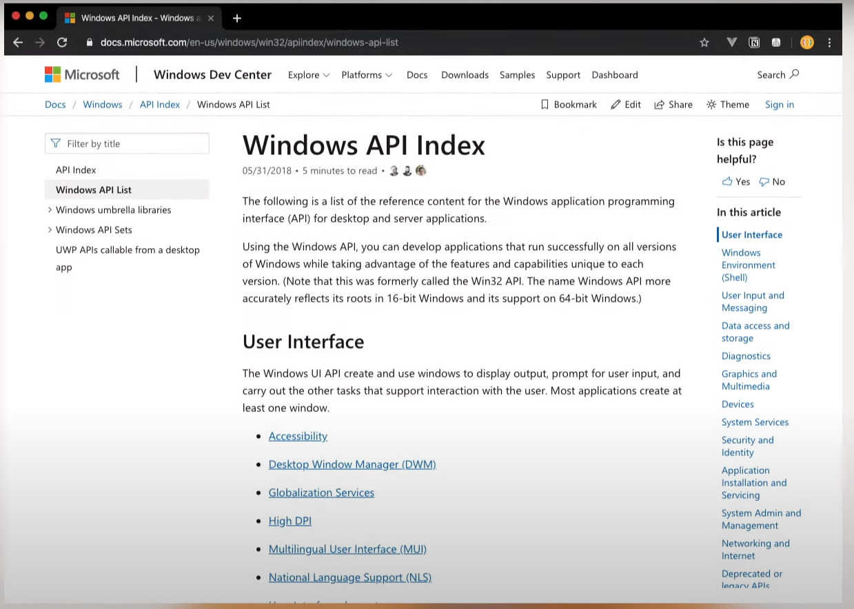 윈도우에는 개발자들이 프로그램을 개발할 때 시스템이나 하드웨어에 대한 세세한 지식이 없어도 지정된 명령어로 동작을 수행하도록 소프트웨어를 짤 수 있는 Windows API 를 제공한다.