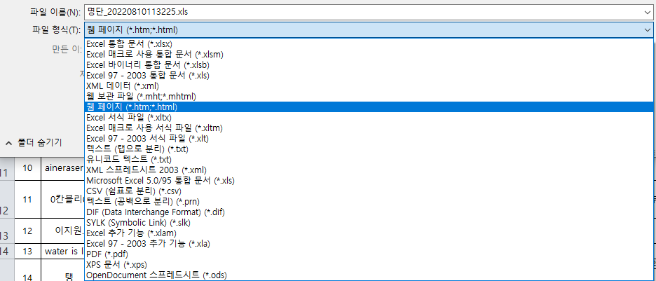 웹 페이지로 되어있는 해당 파일을 반드시 Excel 통합 문서로 저장해야 한다.
